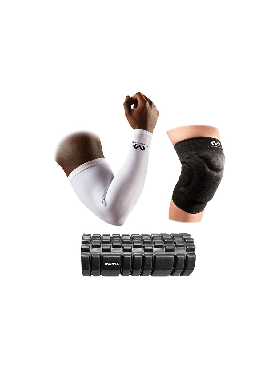 ZESTAW BLACK WEEK 2025: McDavid Ochraniacze kolan Flex-Force 602 (czarne), McDavid Rękawy kompresyjne Compression Arm Sleeve 6566 (biały) oraz roller WERON w kolorze czarnym.