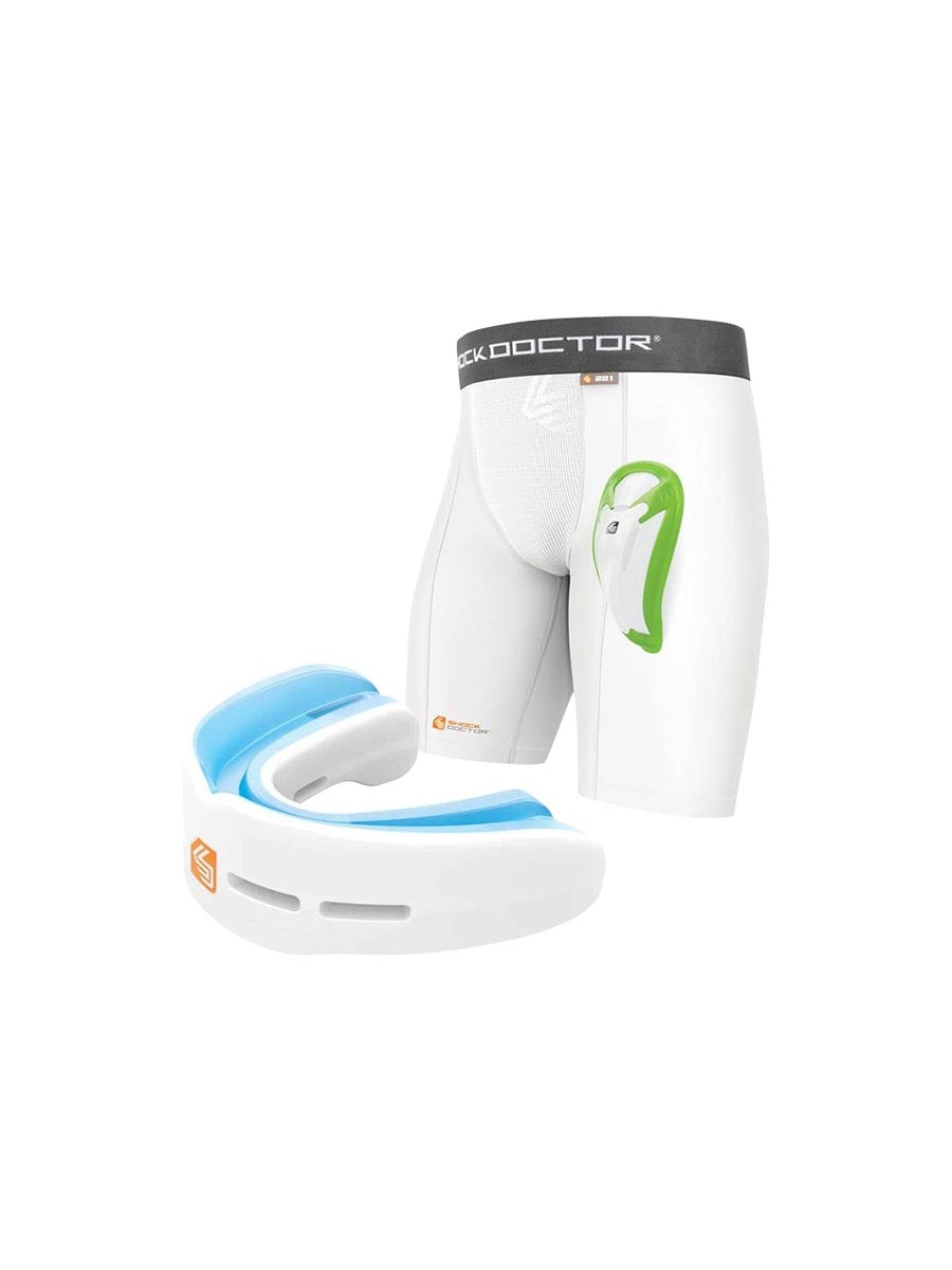 ZESTAW BLACK WEEK 2025: Shock Doctor ochraniacz szczęki Nano Double dla dorosłych (biały) oraz Shock Doctor spodenki kompresyjne z suspensorem Bioflex (białe).