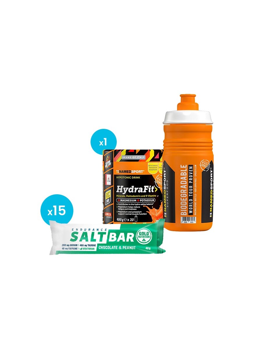 ZESTAW BLACK WEEK 2025: Goldnutrition Endurance Salt Bar o smaku czekolada - orzechy arachidowe (karton 15 sztuk) oraz Namedsport HydraFit z bidonem.